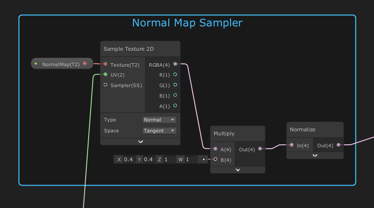 You’ll notice that I multiply the output of the normal map sampler by (0.4,0.4,1). This weakens the sideways components while leaving the vertical alone. Essentially making the vector point slightly more towards the Z direction. Then, after re-normalizing it, I get a new normal vector that is my sampled texture, but dampened slightly. I would ramp up the strength of this normal map in conjunction with the strength of my height sampling in the vertex program.