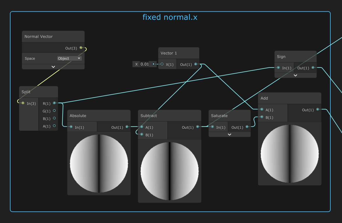 //(abs(normal.x) - 0.001) is actually “segment2” from earlier logic... float equalZero = smoothstep(0,0.01, -1 * (abs(normal.x) - 0.001)); position1 = lerp(position1WhenXNonZero, position1WhenXZero, equalZero);